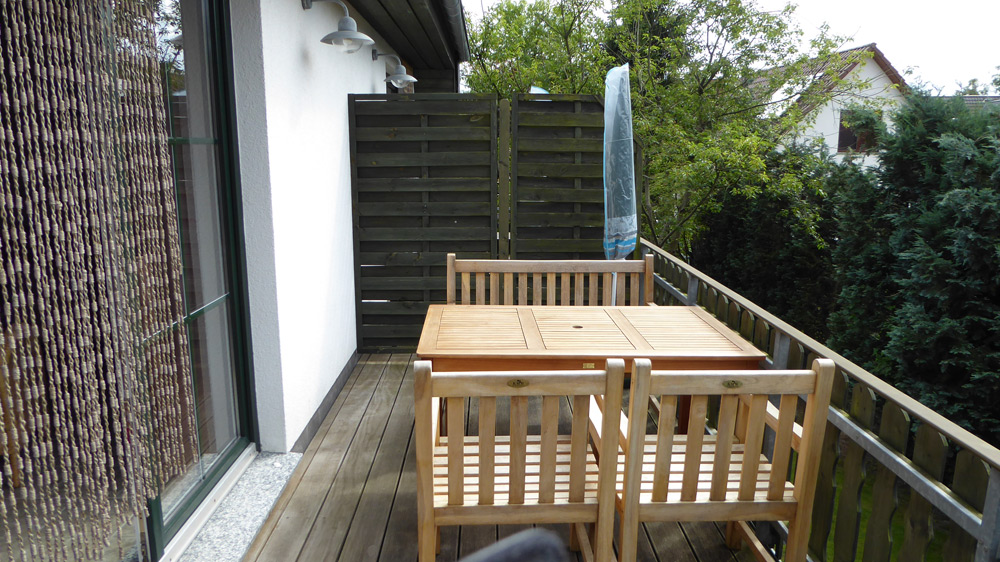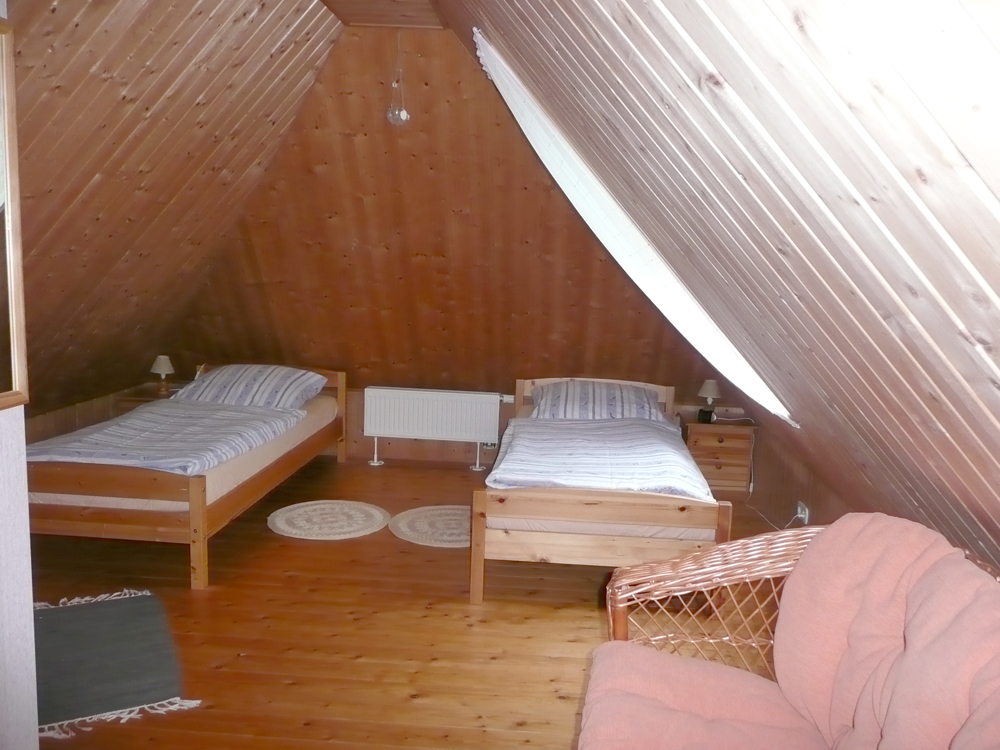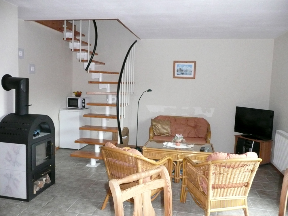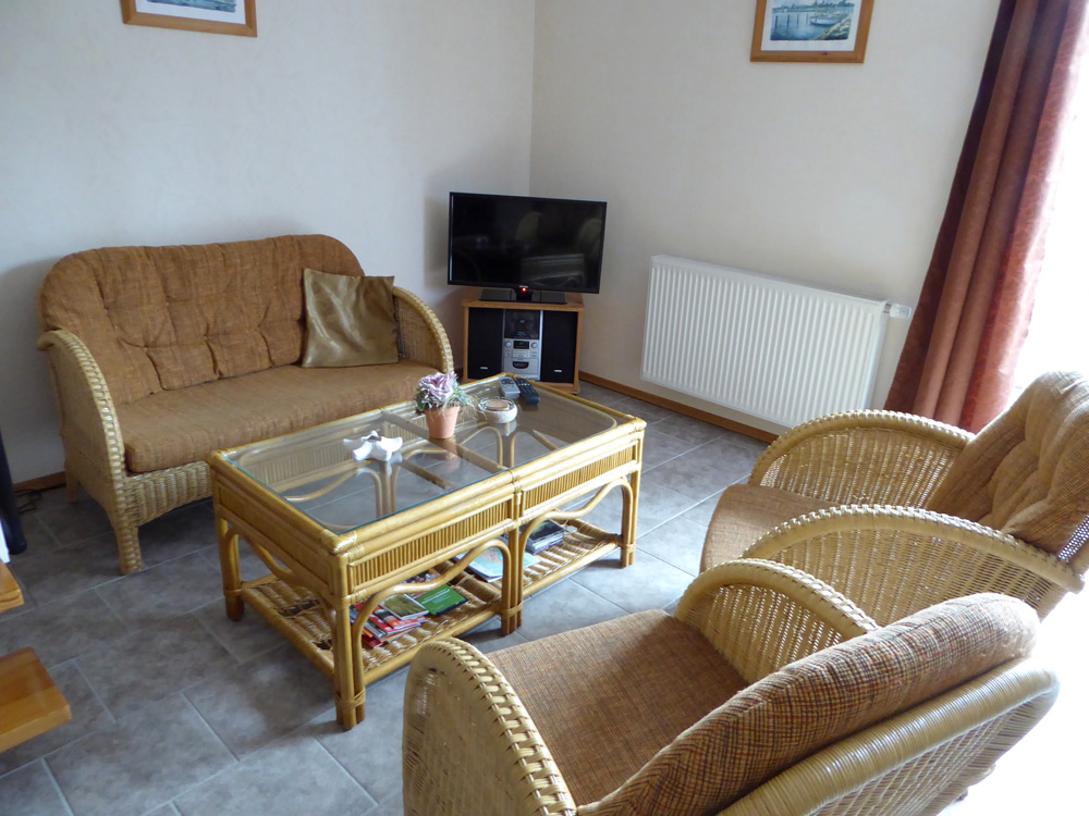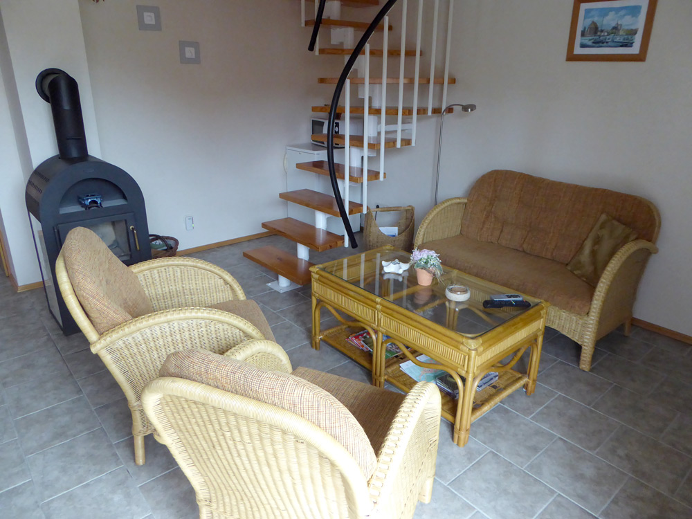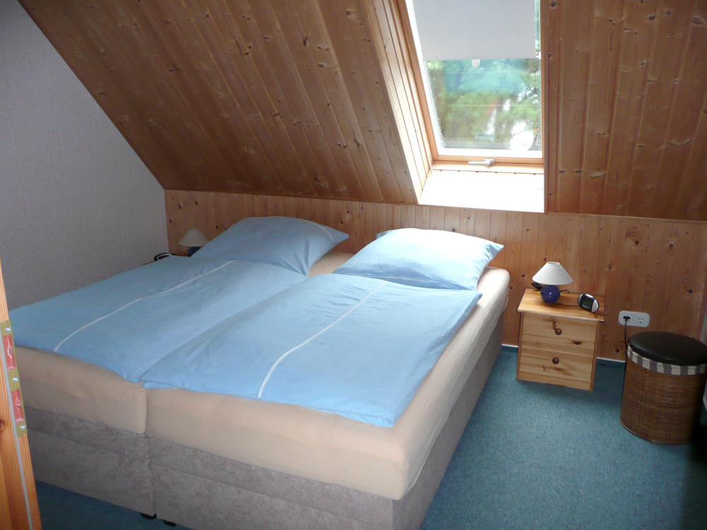 - 2 Schlafzimmer (ein Schlafzimmer mit Doppelbett, das zweite Schlafzimmer mit zwei Betten ist über eine offene Treppe vom Wohnzimmer aus erreichbar)
