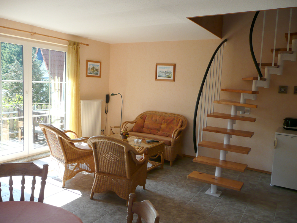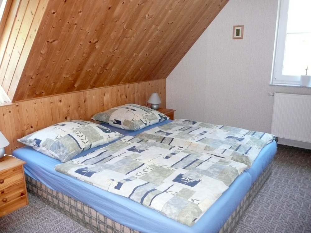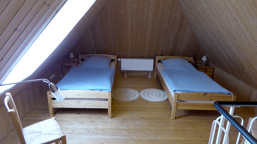 - 2 Schlafzimmer (ein Schlafzimmer mit Doppelbett, das zweite Schlafzimmer mit zwei Betten ist über eine offene Treppe vom Wohnzimmer aus erreichbar)